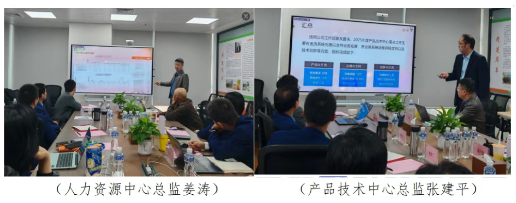 职能部门汇报环节,人力资源中心、产品技术中心分别复盘2025年工作:人力资源中心围绕人力概况、工作成效和2026年工作计划,明确2026年人力资源中心工作重点;产品技术中心聚焦产品研发、技术支持、创新交流等工作,梳理技术成果与应用情况,规划2026年技术突破方向。