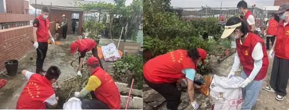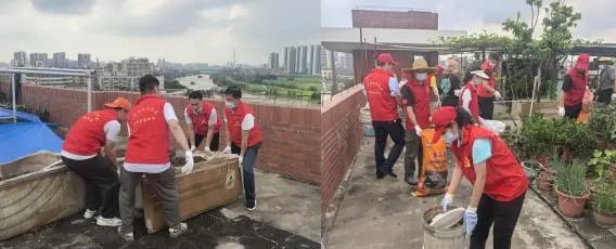 在陈远安经理的带领下,佛山市颐养院保洁项目部员工黄 土勤、高克碧、凌美华等员工全面清理、清除积水、杂物,以 细致入微的行动切断病毒传播链条。