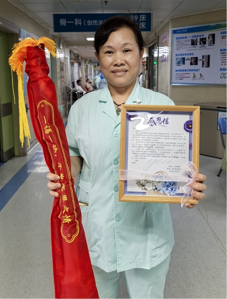 凭借多年在骨科护理工作中积累的专业知识,梁超瑜迅速判断老人的状况。她轻声安抚着惊慌失措的老人,“阿叔,别害怕,我是医院骨科工作的护工阿姨,让我来看看”,温柔的话语像一剂镇定剂,让老人的情绪渐渐平稳。随后,她小心翼翼地协助老人固定受伤的胳膊,避免二次伤害。紧接着,她又向周围的路人求助,和两位热心路人一起,小心翼翼地将老人搀扶起来,送往附近医院的急诊科。