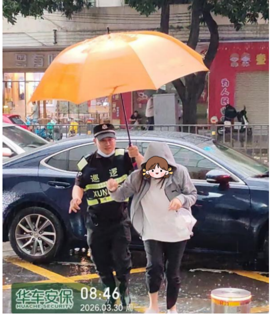 一位保安员在医院入口执勤时,敏锐地发现一名刚从车上下来的女孩子手中未带任何雨具,正大步奔跑着躲避雨水。他没有丝毫犹豫,立即快步上前,熟练地撑开雨伞,将伞面稳稳罩在女孩子身前,一边叮嘱她“小心脚下”,一边加快脚步,全程贴心护送她安全抵达门诊大厅。