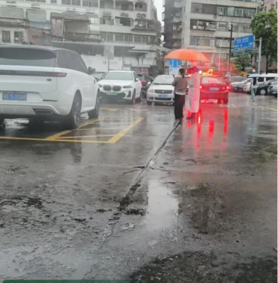 停车场内,家属站在雨里等车。另一位保安员默默走过去,把伞递到家属头顶:“您别急,车马上到,我陪您等。”几句轻声安抚,缓解了雨天的寒凉与等待的焦虑。